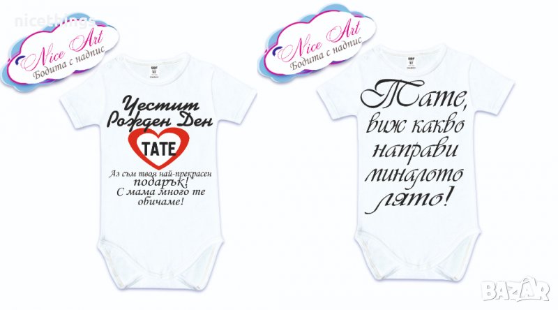 Бебешки бодита с индивидуален дизайн за всеки повод.Надпис по ваш избор ,цвета на текста е по ваш избор.Размери може да изберете от таблицата в снимките.Експресна изработка.