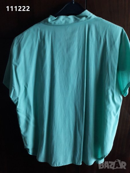Продавам резедава (може би светъл електрик) лятна дамска риза с ръкав тип "прилеп", т.е. изкроен заедно с предницата (съответно с гърба); с подложки на раменете, облечени от същия плат, от който е ризата.; с яка, която може да се носи както закопчана, така и като деколте с ревери; с басти на бюста (диагонални, не напречни); подходяща е за по-едра жена.