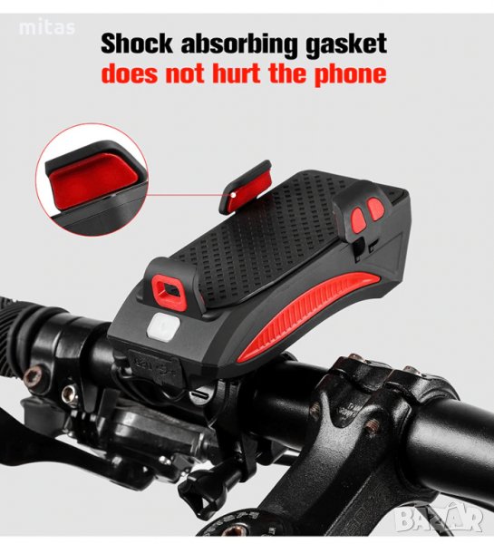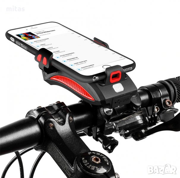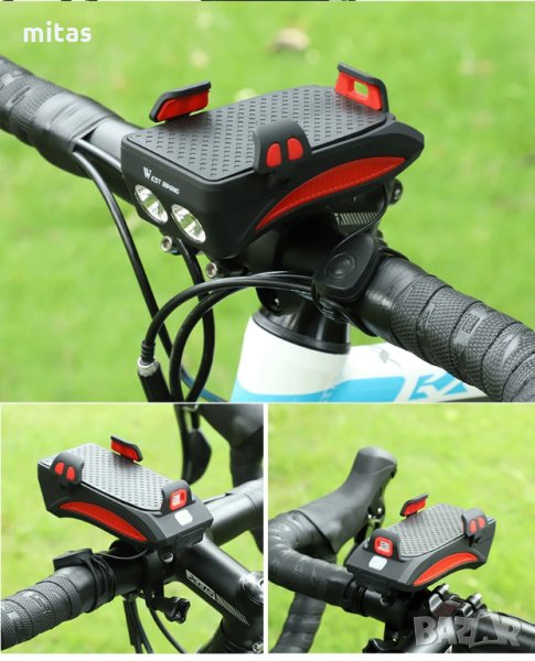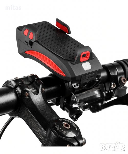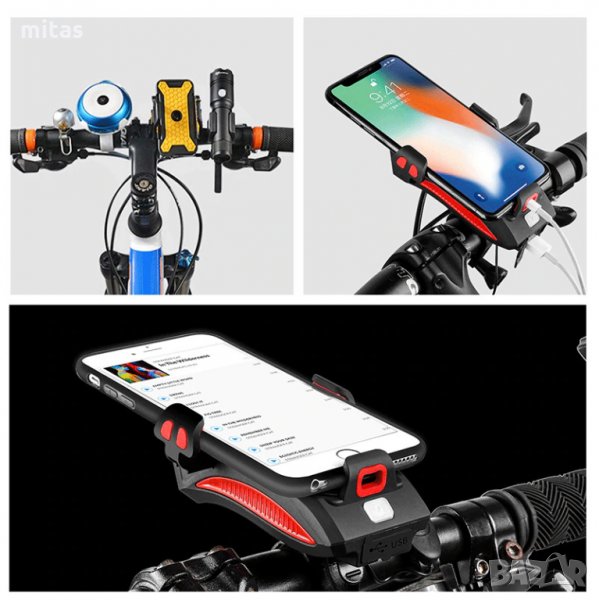 4 в 1 - Велосипедна светлина, Звънец, Поставка за GSM, Външна батерия