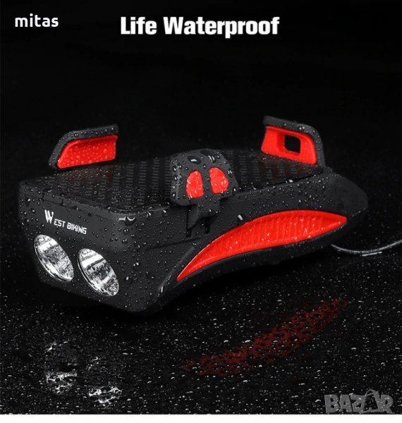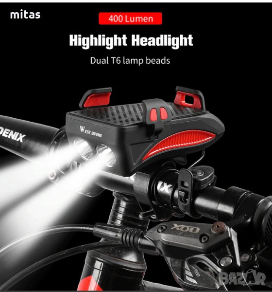 Мултифункционален LED фар за велосипед, звънец, стойка за мобилен телефон и външна батерия.