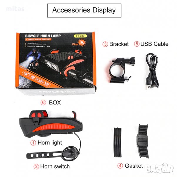 ** Мощен високоговорител, силно концентрирана светлина на дълги разстояния, универсален държач за мобилен телефон, USB зареждане, водоустойчив, батерия с голям капацитет, три светлинни режима, пет звукови режима, лесно монтиране без допълнителни инструменти.