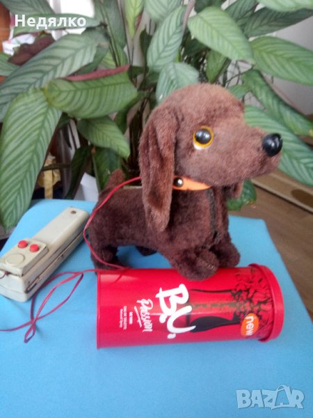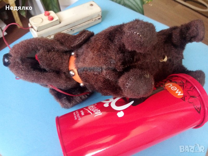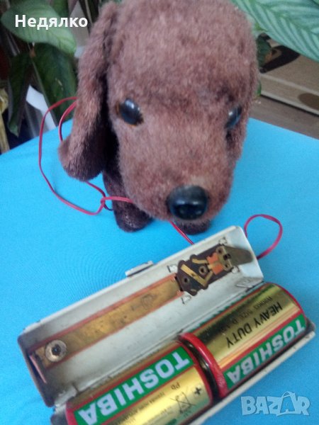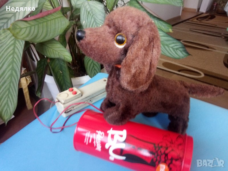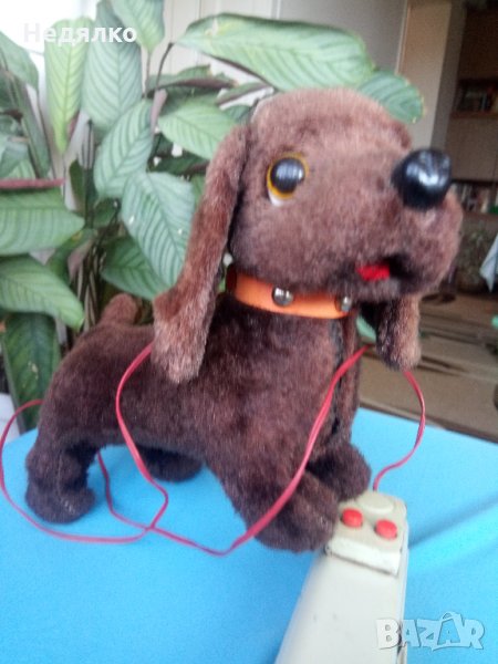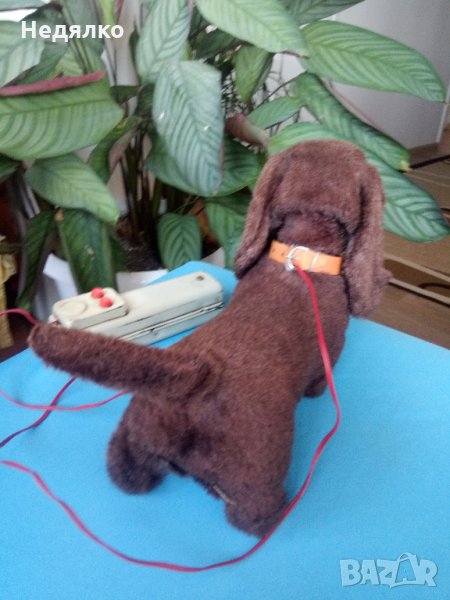 От 1965г в много добро,работещо състояние.Кучето е изработено от метал,покрит с фин кафяв плат,метално управление с 2 батерии по 1,5 волта,при натискане на 1-то копче кучето се движи,върти глава и опашка,при 2,стои на място,върти глава и лае.Рядка колекционерска находка за ценители,като истинско е...Дължина-25 см,височина-17 см.
