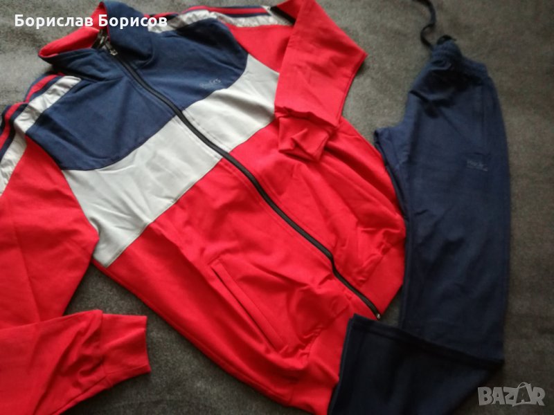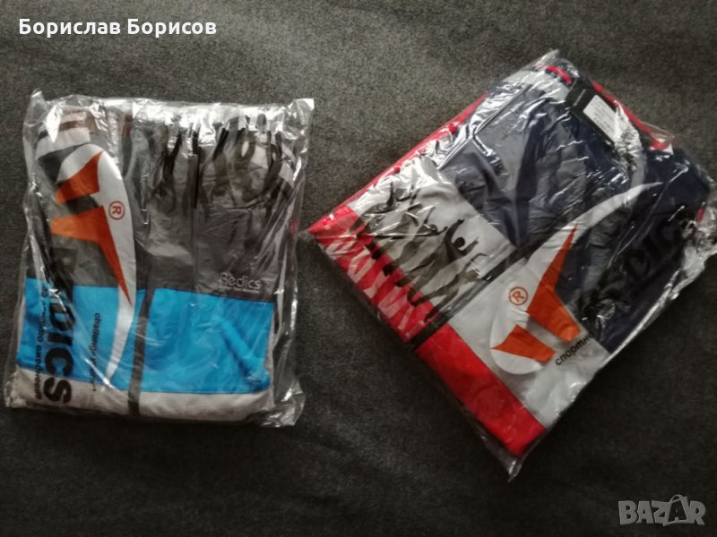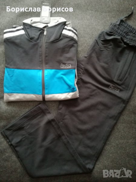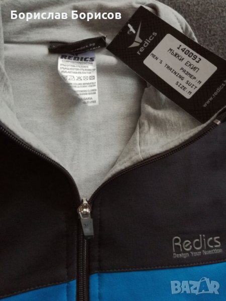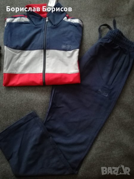Нови, спортни екипи на REDICS. Размер по етикет М. Долнище с прав крачол, с два джоба с цип, широк ластик на талията и възможност за допълнитено пристягане с връв. Горнище- с два джоба с цип. Високо качество на материя и изработка- 77% памук, 17% полиестер и 6% еластан. Размери: Долнище - дължина - 100см., от чатал- 72см., талия -33см., разпъната -48см. Горнище - дължина- 68см. , ширина при мишници - 56см., ръкав от яката 78см., от мишницата 51см..