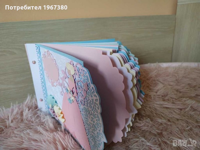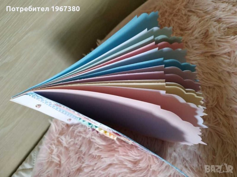 Книга за пожелания в актуални пастелни цветове в стил "френски макарони". Състои се от цветни и бели листи общо 12 на брой, като има възможност да се добавят или премахнат страници.