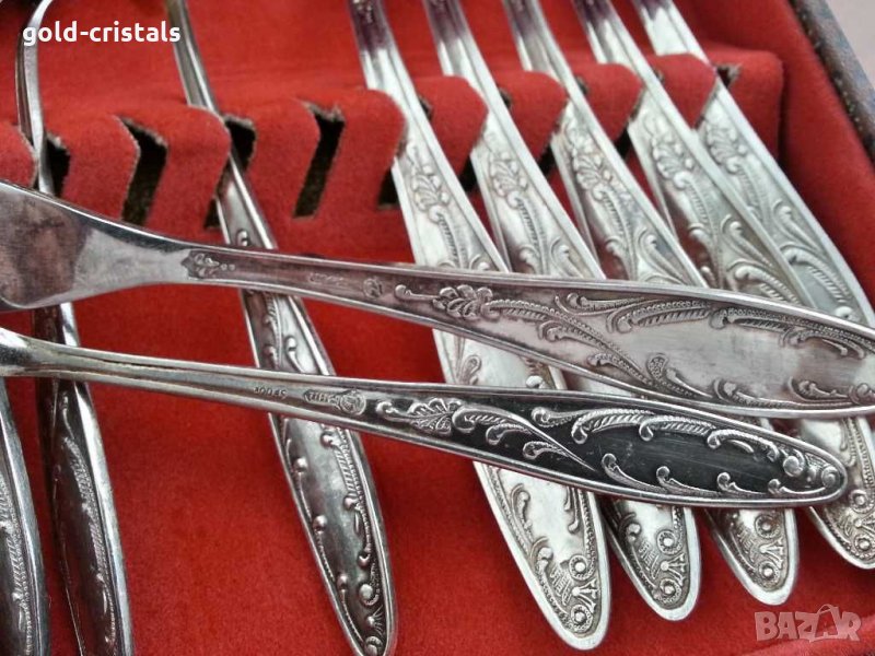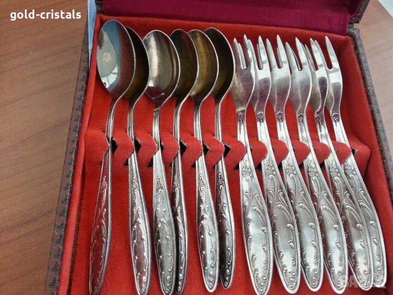 Руски прибори за хранене в кутия 6бр вилички за десерт и 6бр лъжички за чай кафе десерт маркирани гравирани съветски ссср сервиз комплект сет лот ретро арт декор винтидж колекция стари антикварни предмети обзавеждане за дома и семейството подходящи за подарък за ценители и колекционери