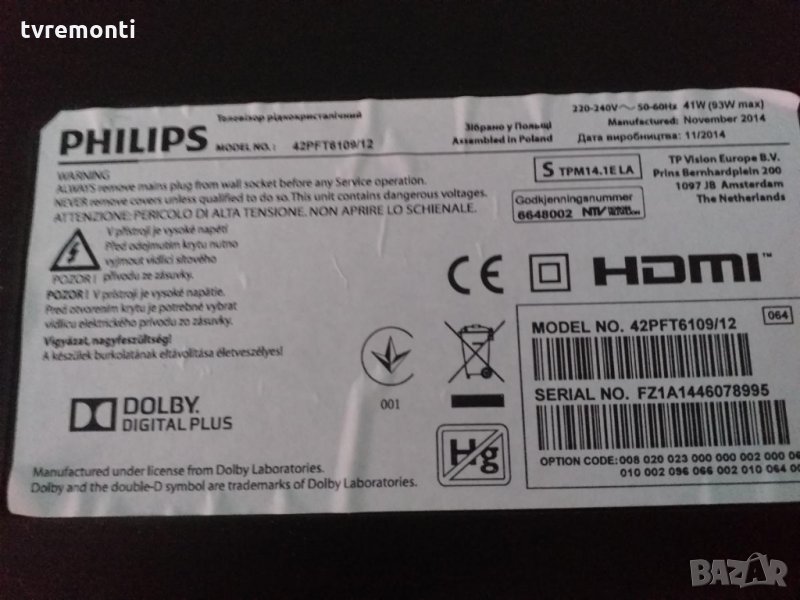 POWER BOARD 715G6169-P01-W22-002H PHILIPS модел 42PFT6109/12 дисплей TPT420H2-DUJSGK revS1B Борда е гарантирано работещ Демонтиран от телевизор със счупен дисплей LTJ400HV11-V инча тествана от нашия техник