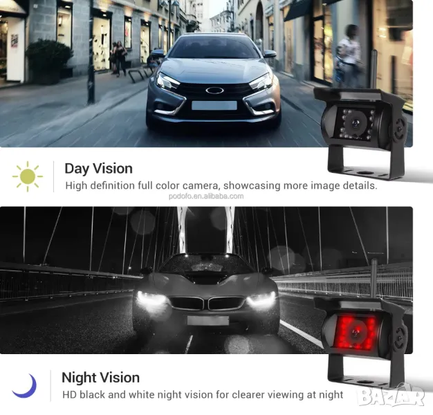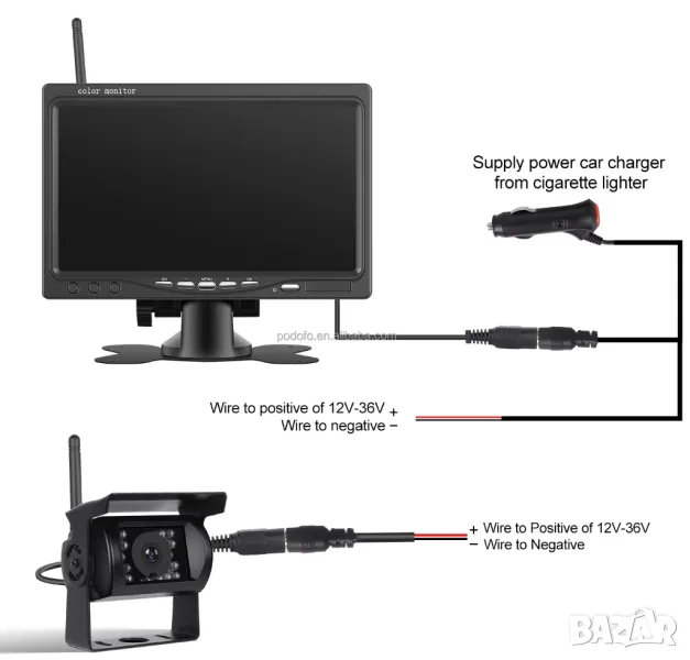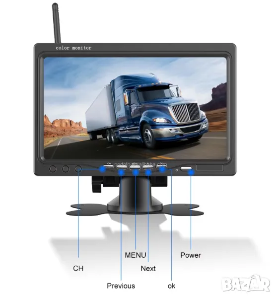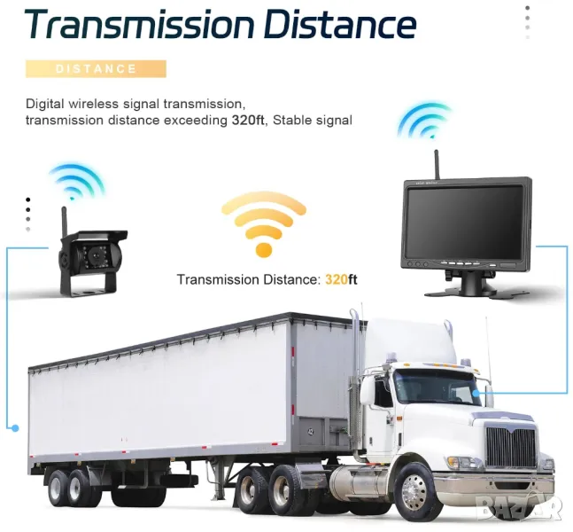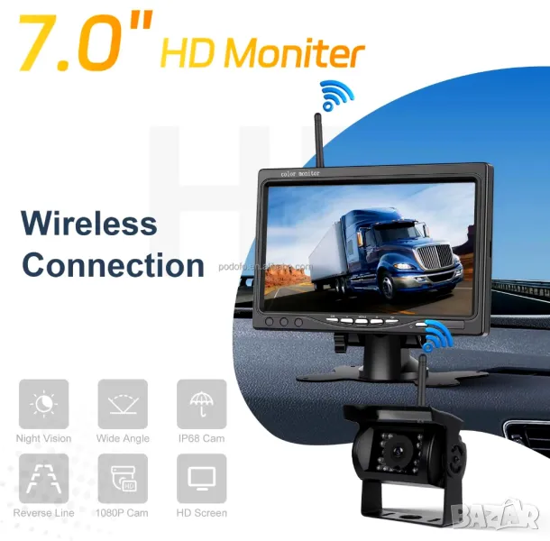 7-инчов HD TFT LCD монитор с широкоекранен екран с вграден 2.4GHz безжичен приемник за обратно виждане IR вискозащитна резервна камера за обратно виждане с вграден 2.4GHz безжичен предавател - Автомобилен водоустойчив обектив, с 18 индивидуални инфрачервени (IR) LED.
