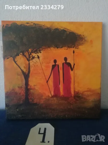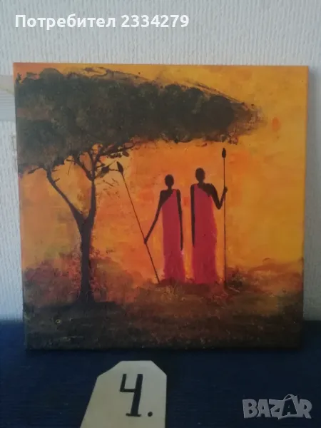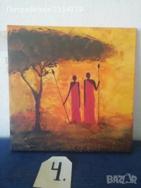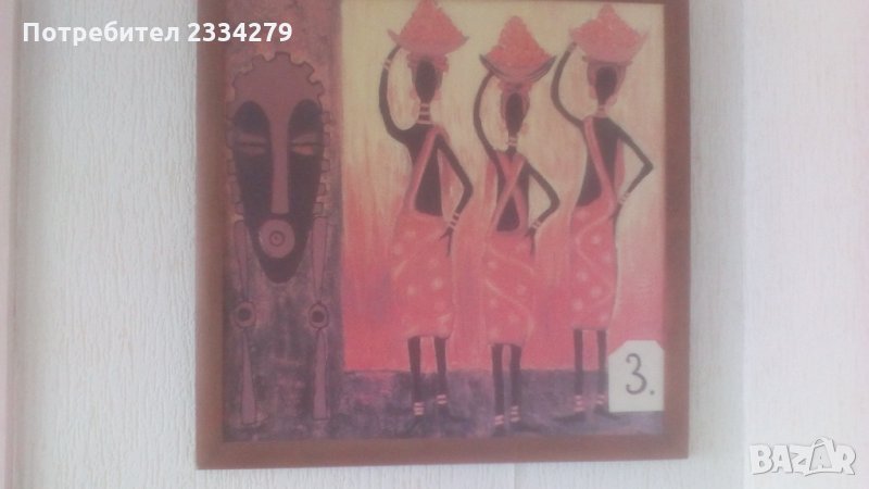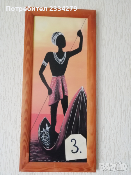 ,, Берачки на плодове",, МАЙКА С ДЕТЕ",, РИБАР" картини с африкански сюжет,декопаж с маслени бои, произход: лично закупени преди 17години от магазин в Прага, Чехия. Размери: 55Х55см., цена 17€. брой. Малката рибар размер 55х25см., цена 13€. N:4 рисувана картина маслени бои, размери: 30х30см.,цена 6€.