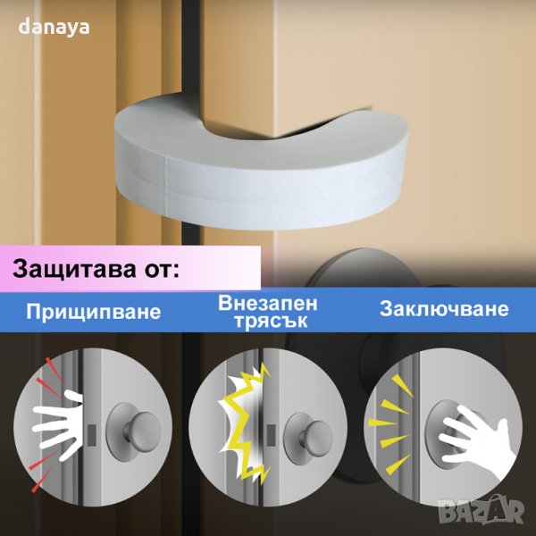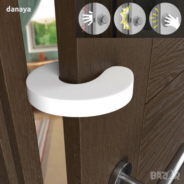 Предпазител за врата, стопер, който придържа вратата леко отворена и не позволява внезапното ѝ затваряне. Изключително полезен аксесоар за малки деца. Стоперът предпазва малките пръстчета от прищипване и нараняване. Поставете стопера на място, където детето не може да го стигне и махне.