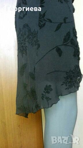 Роклята е от ластичен тюл с релефни красиви цветя и листа.
