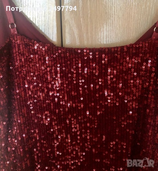 Официална рокля с презрамки Mohito, с пайети, цвят бордо. Размерът е 34, но тъй като е малко еластична може да се носи и от дама 36 размер. Много ефектна и удобна, обличана един път.