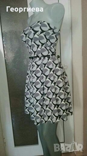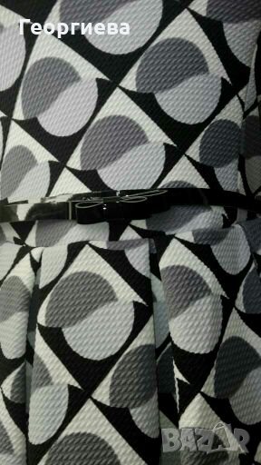 Изключително красива, от полиестер и еластан.Цветовете са сиво, черно и бяло.Плата има лек релеф, който ясно се вижда на снимката в близък план.Коланчето е лачено, с форма на панделка - много красиво!Роклята е без подплата, но такава не е и нужна - не прозира!Има вградени подплънки.