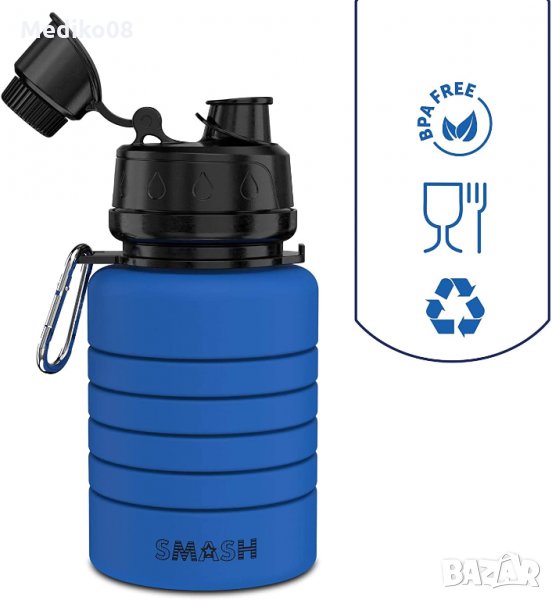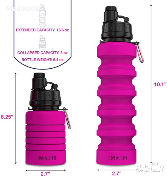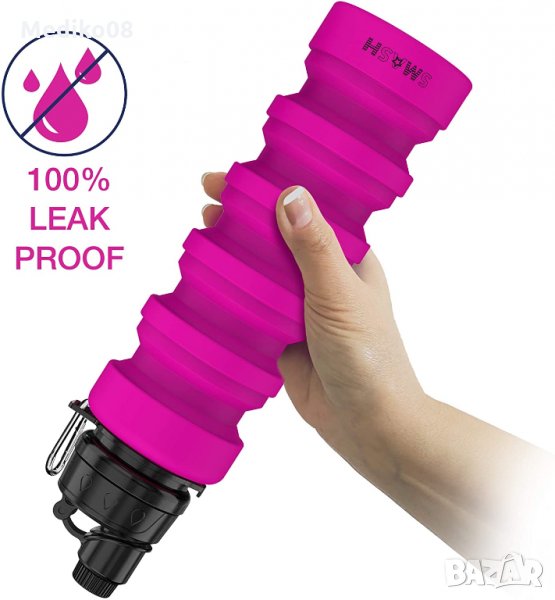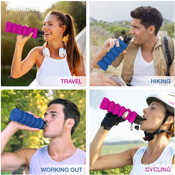 Универсален продукт, който впечатлява със своята практичност. Сгъваемата бутилка от силикон е нетоксична и не променя вкуса на напитките, съхранявани в нея. Нейните най-големи предимства са, че тя не може да бъде счупена, изключително лека е и заема много малко място, когато е сгъната. незаменим спътник по време на планински екскурзии, ваканции, тренировки или велосипеден туризъм.