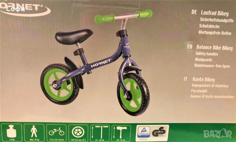 С баланс байка разходките се превръщат във возене с гарантиран забавен фактор. Новопридобитата скорост е страхотно забавление за децата! А родителите са щастливи от предпазното оборудване с калници, кормилото с пренапрежение и предпазни дръжки. Bikey е оборудван с 10-инчови EVA колела с ниска поддръжка. Подходящ е за малки потребители до 35 кг. Седлото е регулируемо от 39 см до 43 см, височината на кормилото от 53 см до 56 см. Общите размери са приблизително 71. 5 см х 32 см х 56 см.