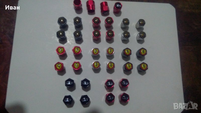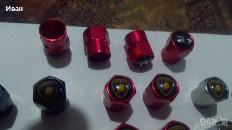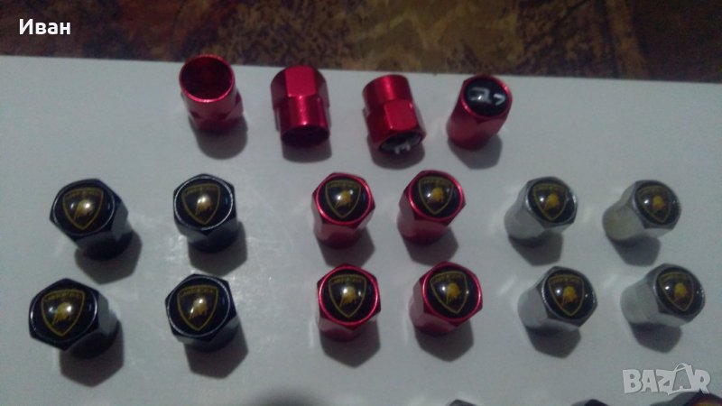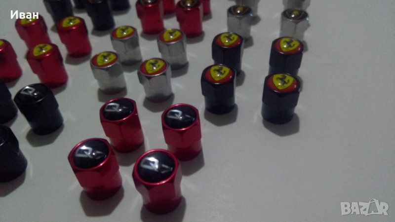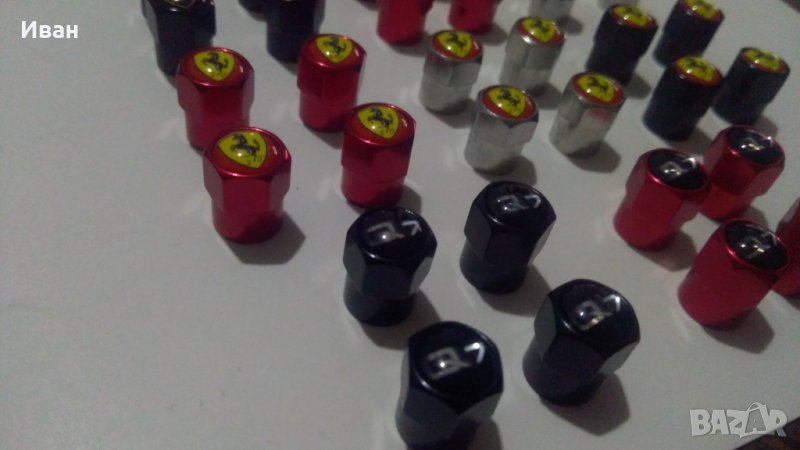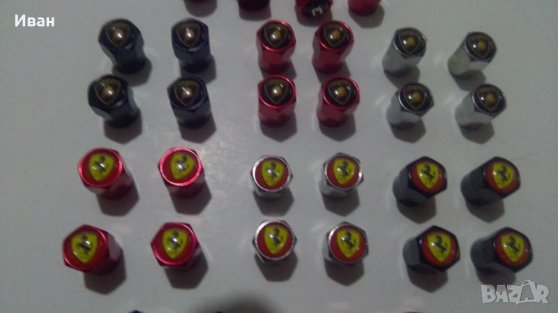 Предлагам и шестограмни метални капачки за вентили в цвят червен ,син , зелен ,черен и сив с цветни емблеми на Ферари Ferrari , Lamborgini Ламборджини и Форд Мустанг Ford Mustang .