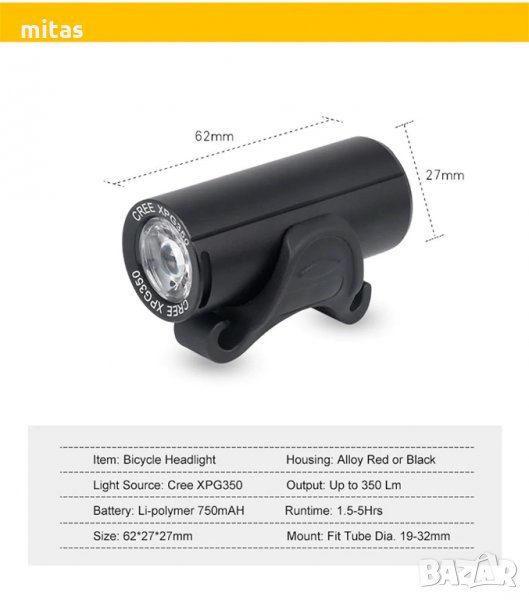 Акумулаторна LED светлина фар за велосипед колело 350 lumen