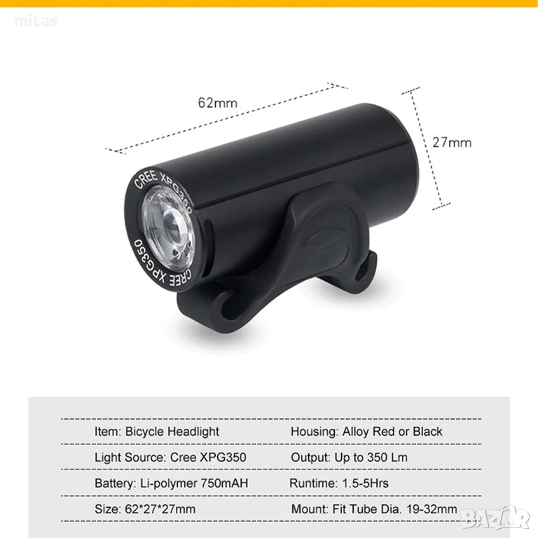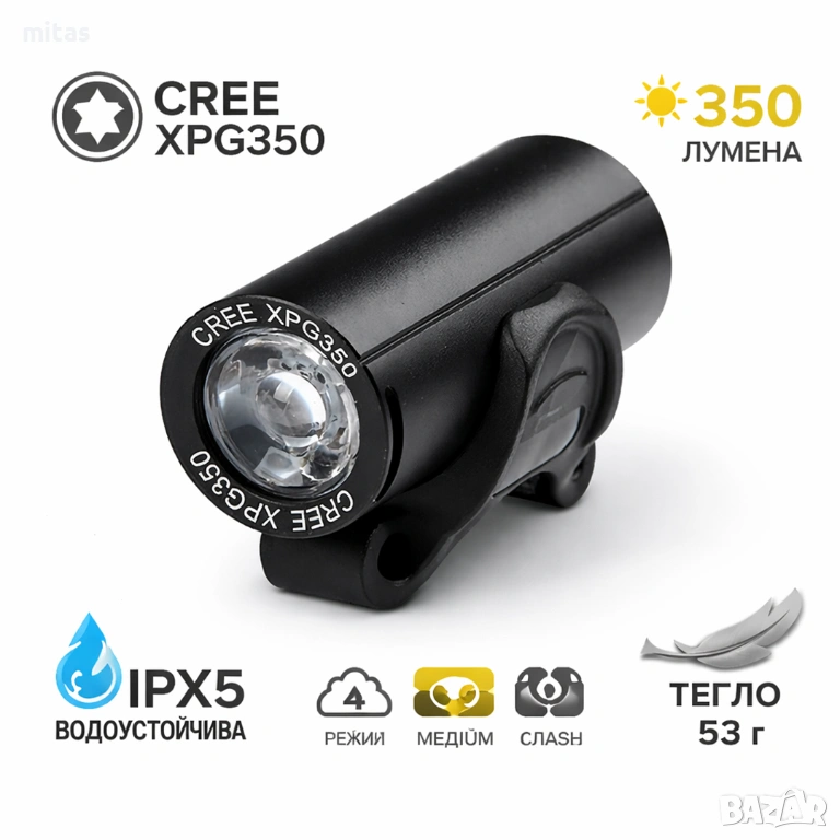 - Висока осветеност (350 lm) – осигурява добра видимост на пътя и околната среда.