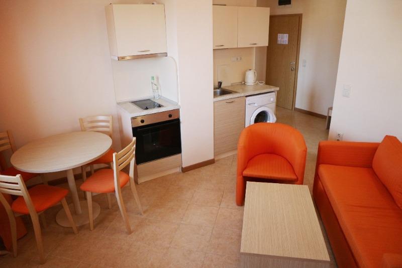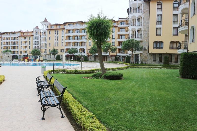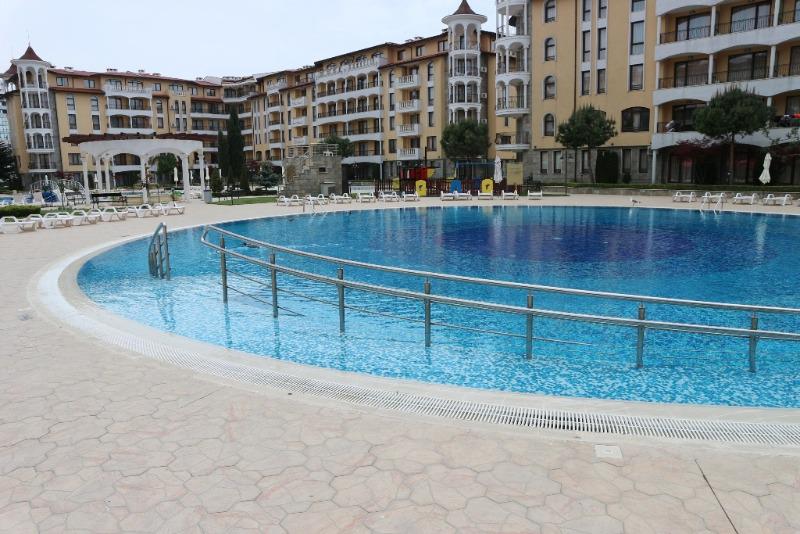 бюро; Фризьорски салон; 24-часова рецепция; Шезлонги и чадъри на басейна; 24-часова охрана; Пералня; Магазин; Детска площадка; Паркинг. Жилищетоо се намира на шести етаж и е напълно обзаведен и оборудвано. Разполага със всекидневна с кухненски бокс, две спални, баня с тоалетна и хубава тераса. Годишната поддръжка е 17 Евро за кв.м с ДДС.