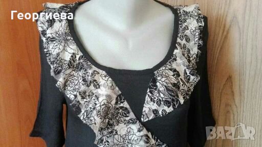 Красива рокля с 3/4 ръкав - наситено черен цвят и украса от къдри в черно и бяло, като тези на цветя са от дантела, а къдрите на точки са от плътен полиестер.Много раздвижен и интересен модел!Размер по етикет - S(38).Платът е леко прозрачен и на вид прилича на