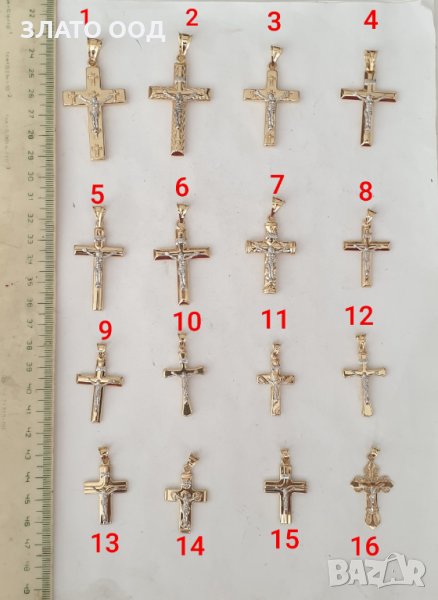Златни кръстове. Сертификат и маркер 585-14К. Номера от 1 до 16 са с тегла ориентировъчниот 1,65гр до 4,10 гр. Номера от 17 до 41 са с ориентировъчни тегла от 0.90 гр до 2,50 гр.