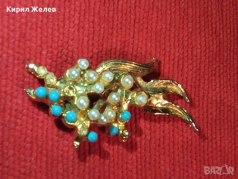 ОЛОВНА ПОЗЛАТЕНА ПЕРЛЕНА БРОШКА с ТЮРКОАЗ СТАРИННА 11124