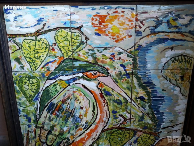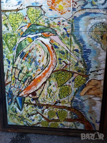 картина-птица.рисувана на керамични плочи,в дървена рамка с размери 64см/52см.