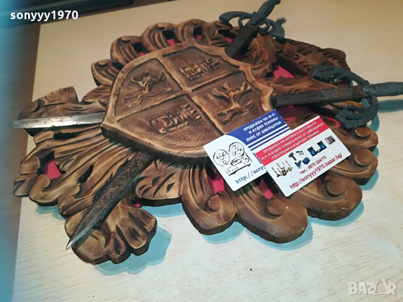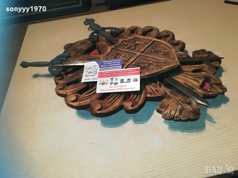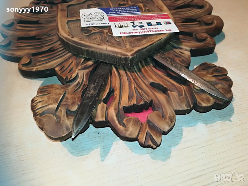 два меча в дървена поставка-герб-красота стил и класа-за колекция декор-50х37см-пращаме със спиди или еконт с преглед и тест след превод на капаро за куриерската услуга поради зачестили некоректни потребители-поръчки само тук в саита! по телефона и със смс не! краини цени! бартери не правиме! ПАРИ НЕ ВРЪЩАМЕ! всеки ден нови неща-още 2-3 наши обяви тук