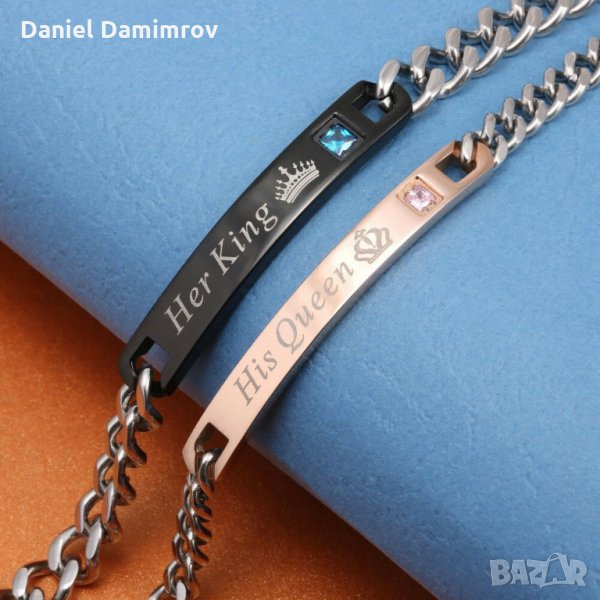Гривните са гравирани с надписи "King" и "Queen", което ги прави уникални и лични за двамата ви. Освен това, гривните съдържат кристали в синьо и розово, което придава допълнителен блясък и красота на този комплект.
