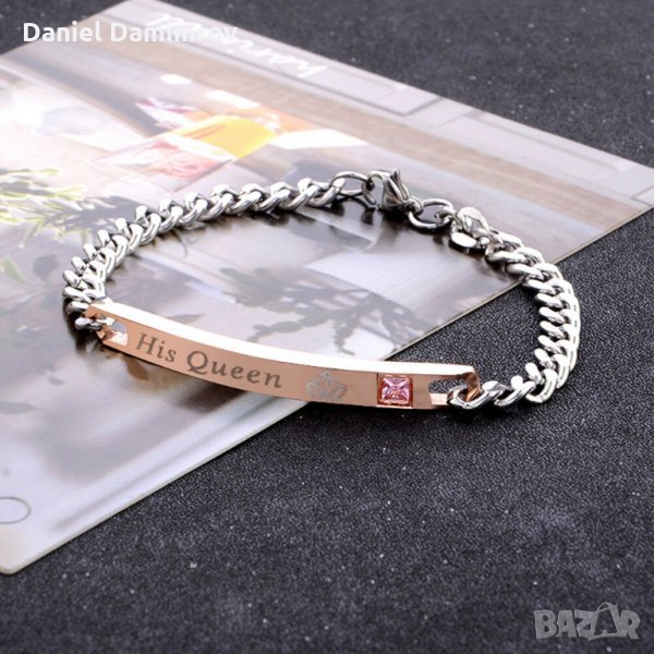 Този сет от мъжка и дамска гривни е стилен и персонален подарък за влюбените "King & Queen". Изработен е от висококачествена неръждаема стомана и титан, които гарантират дълготрайността на гривните и им придават елегантен вид.