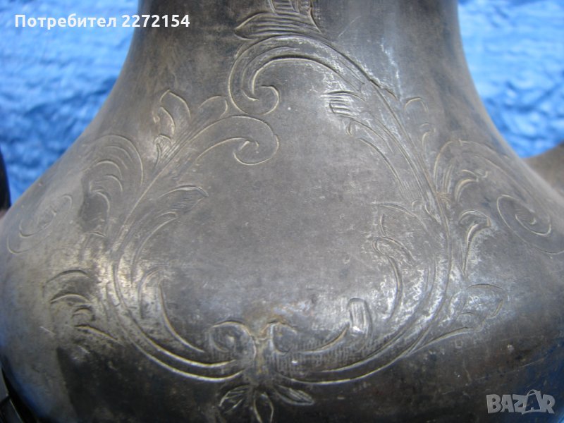 Ръчно изработен за британския кралски двор през втората половина на 19 век,според мен е посребрен,но е възможно да е изцяло сребърен.Дръжката му е отделена от тялото,посредством кръгли камъни,за да стои винаги студена.Здрав и запазен,тестван държи вода.