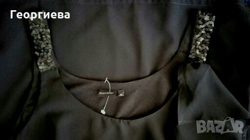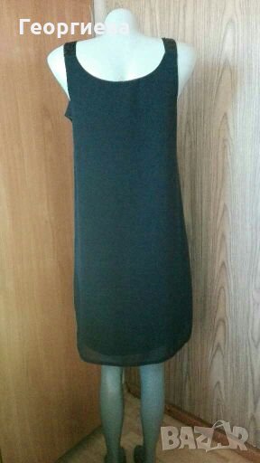 Луксозна нова рокля за повод, или офис.Повърхностния слой е прозрачен, без еластичност, а подплатата еластична и плътна - не прозира изобщо.Презрамките имат украса от черни пайети.Роклята е много стилна и красива!По етикет е 38-ми размер.Ето и подробните размери, които са взети прецизно от мен: