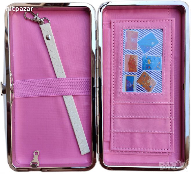 Вътре в лявата част е мястото за закрепване на телефона. По средата се намира частта за вашите банкови и други карти и за вашите визитки.