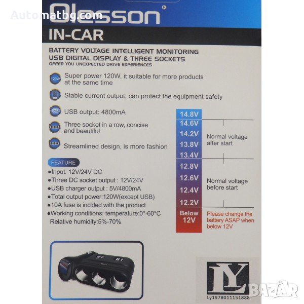 ⇒ Изходящо: 3 броя куплунг запалка + 4 броя USB - 2 x 1000мА и 2 x 2100мА