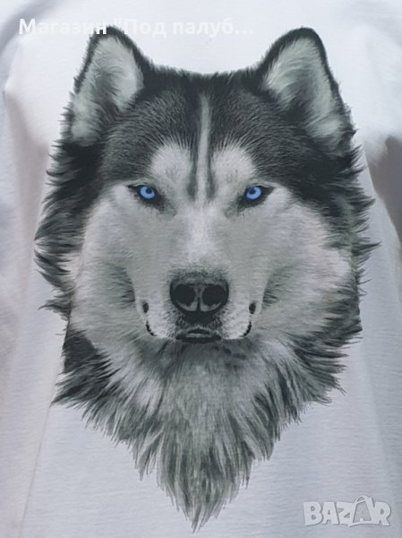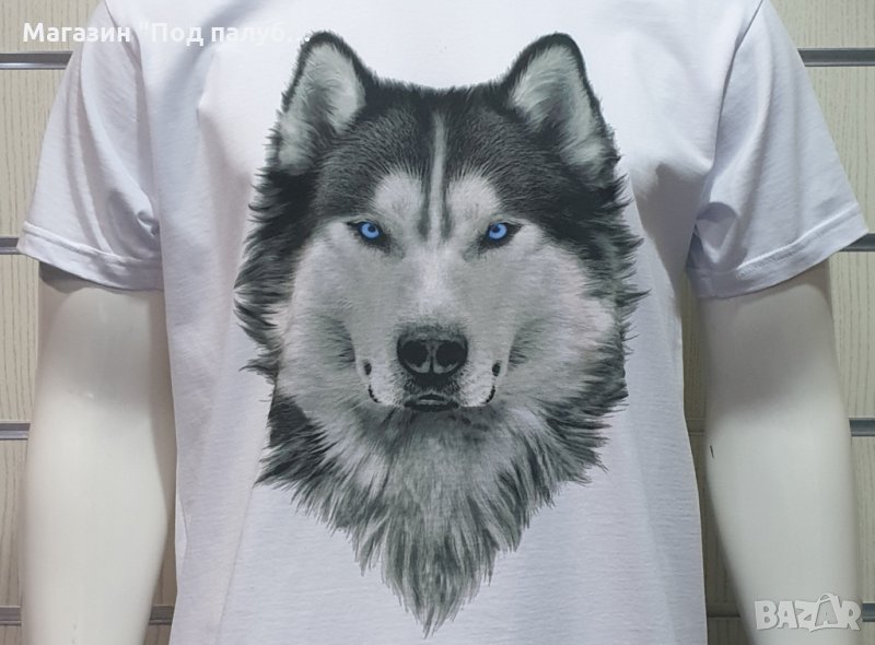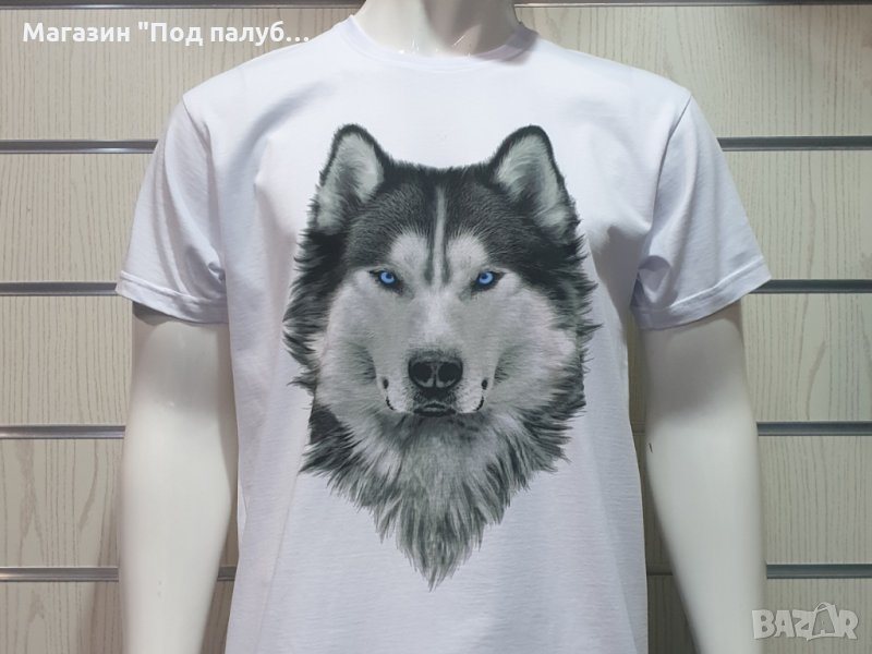 Нова мъжка бяла тениска с дигитален печат Хъски със сини очи