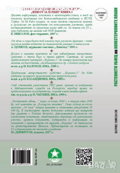 Най-новото трето допълнено издание на книгата на фитотерапевта Борис Николов "Растението убиец на холестеролните плаки" Още в началото на 90-те г. на миналия век препаратите "Боралин" са признати и биват допуснати до обстойни клинични изпитания в ИСУЛ и Авиомедицинския институт към Военномедицинска академия (ВМА). Доказана е тяхната ефикасност и безопасност. Установено е уникалното им свойство да разграждат холестеролните плаки, които стоят в основата на много заболявания. На най-високо ниво е взето решение две от разновидностите на Боралин да бъдат официално внедрени във военната медицина. Своите изследвания Николов събира в настоящата книга. Теоретичните постановки и откритията на автора са подкрепени с множество анкетни мнения на пациенти от дългогодишната му практика, както и от част "Приложения", в която са представени факсимилета на протоколи от редица клинични и лабораторни изпитания.