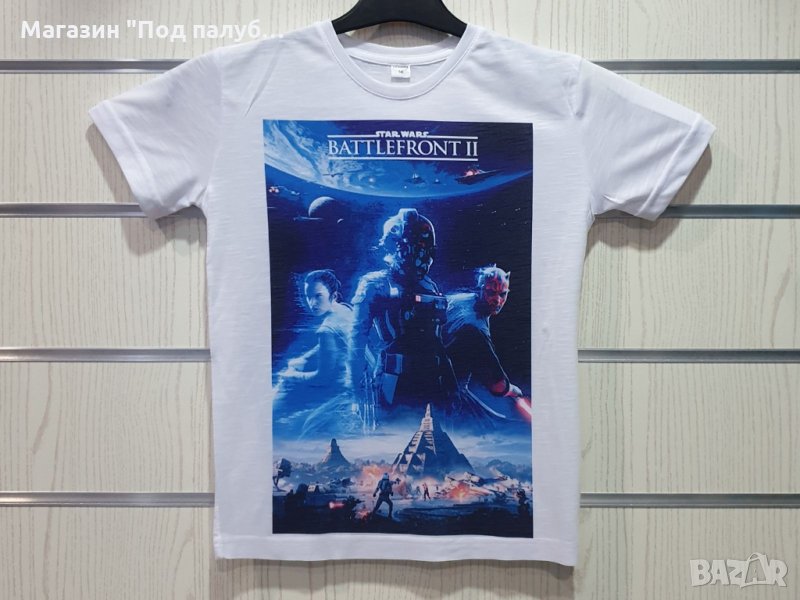 Страхотна нова детска тениска в бял цвят с трансферен печат STAR WARS Battlefront II, Междузвездни войни. Тениската е изработена в България под марката PRINTEX от полиестер, който запазва цялостта на материята и наситеността на цветовете дълго време. С удобна кройка, тениската е свободна и позволява максимален комфорт при носене. Професионално изработен висококачествен трансферен печат, устойчив на пране с години. Тениската може да се пере при температура до 40 градуса. Спокойно можем да гарантираме за качеството на изработката и ярките цветове на дизайна.