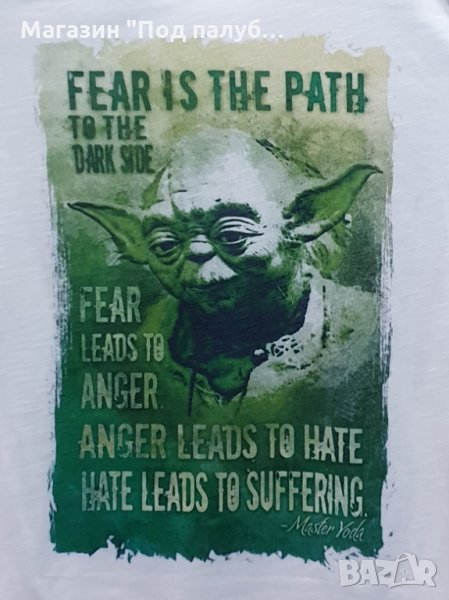 Страхотна нова детска тениска в бял цвят с трансферен печат на героя от Междузвездни войни, Йода, Fear is the path to the dark side. Тениската е изработена в България под марката PRINTEX от полиестер, който запазва цялостта на материята и наситеността на цветовете дълго време. С удобна кройка, тениската е свободна и позволява максимален комфорт при носене. Професионално изработен висококачествен трансферен печат, устойчив на пране с години. Тениската може да се пере при температура до 40 градуса. Спокойно можем да гарантираме за качеството на изработката и ярките цветове на дизайна.