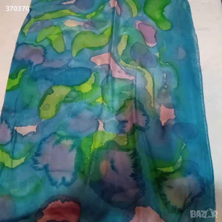1.Красив копринен шал с втъкани нишки от ламе в същия цвят като цвета на шала с дължина на нишката около 9-10 см, разположени вълнообразно върху лицевата страна на целия шал. Размери 130 см/44 см - това е без ресните . Има ресни от по 20 см от двете страни на шала. На снимката шалът е сгънат на две по ширината. - снимка № 1 (основна)