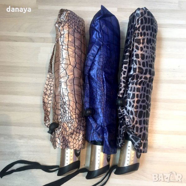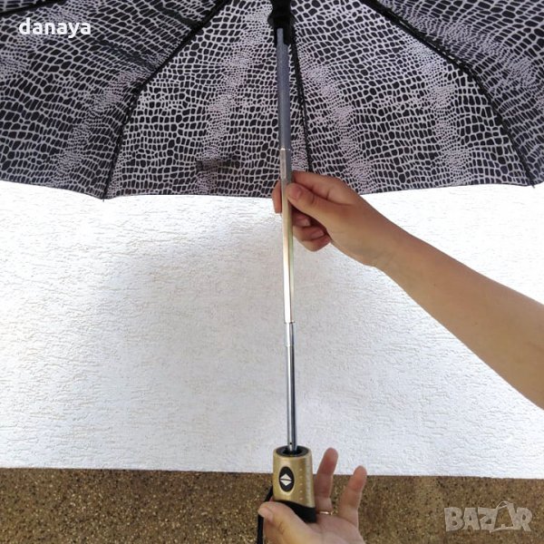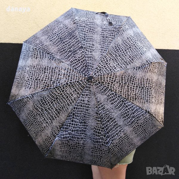 Автоматичен чадър за дъжд, двоен автомат и принт в наподобяващ крокодилска кожа. Чадър с метална основа, 8 метални спици. Автоматично отваряне и сгъване само с едно копче. Две степени на сгъване. Компактен размер в сгънато състояние – 28см. Може да се побере във всяка чанта.