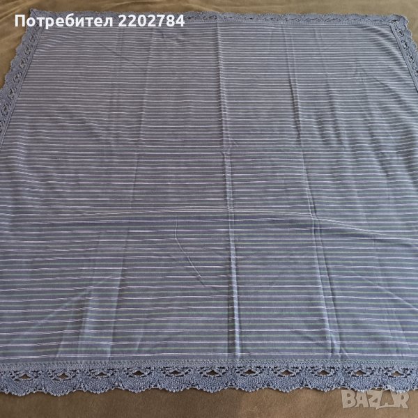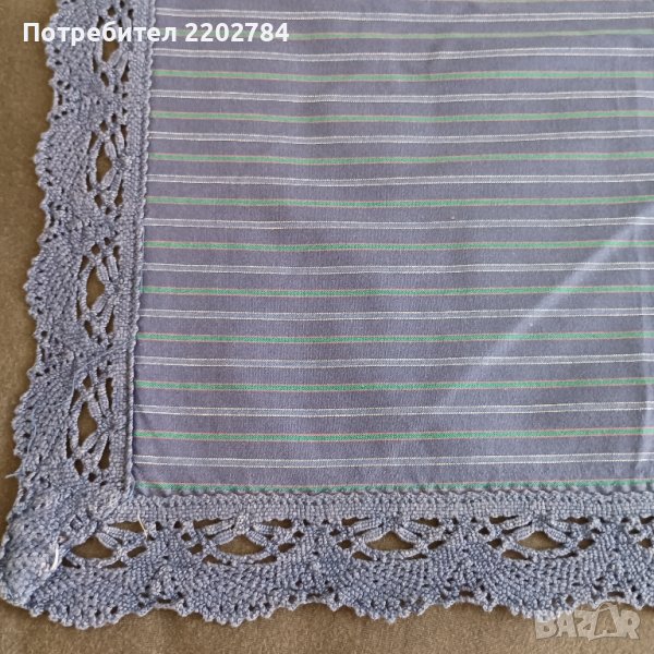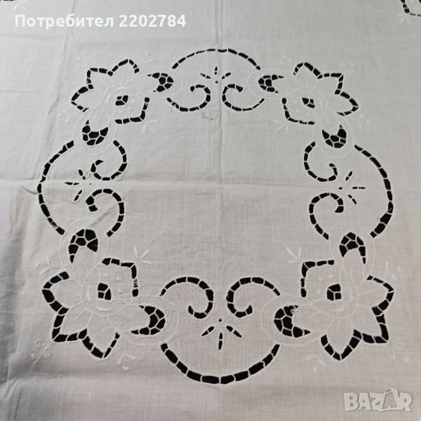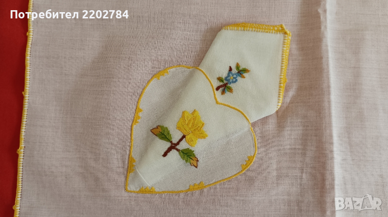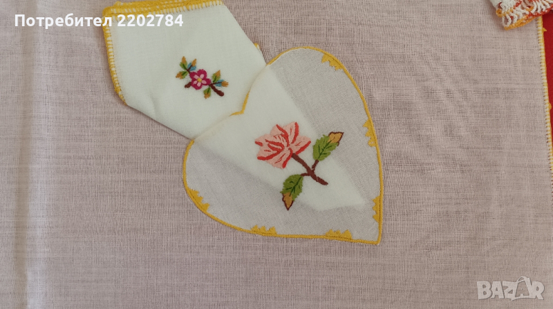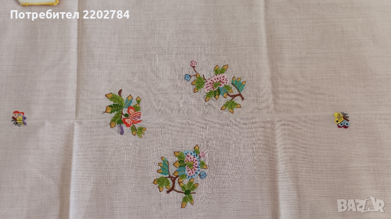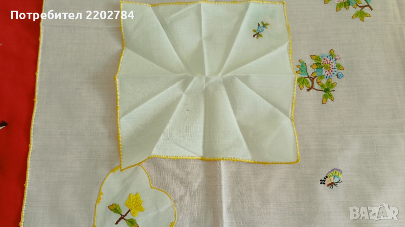 Първото е много интересно - основно каре с малки кърпички към него, които се слагат в малки бродирани джобчета.Карето е чисто ново,но едната кърпичка липсва.Нежни бродерии на цветя.80/80см.