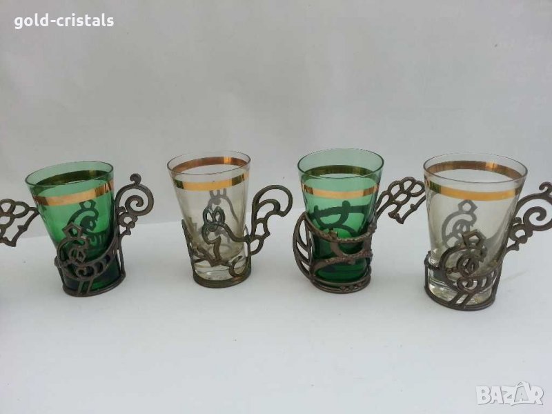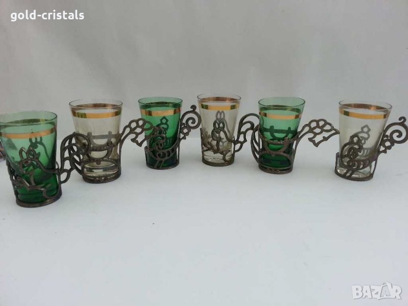 Стар сервиз за ракия-89лв метални подстакани с форма на животни с стъклени чаши цветно стъкло и златен кант позлата антикварна гарафа бутилка шише цветно зелено стъкло гравирана -30лв комплект сет лот ретро арт декор винтидж колекция стари антикварни предмети обзавеждане за дома и семейството подходящи за подарък за ценители и колекционери
