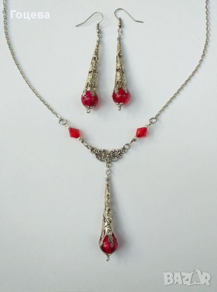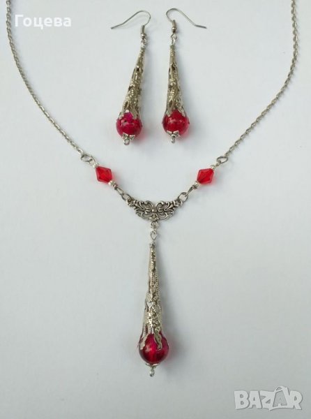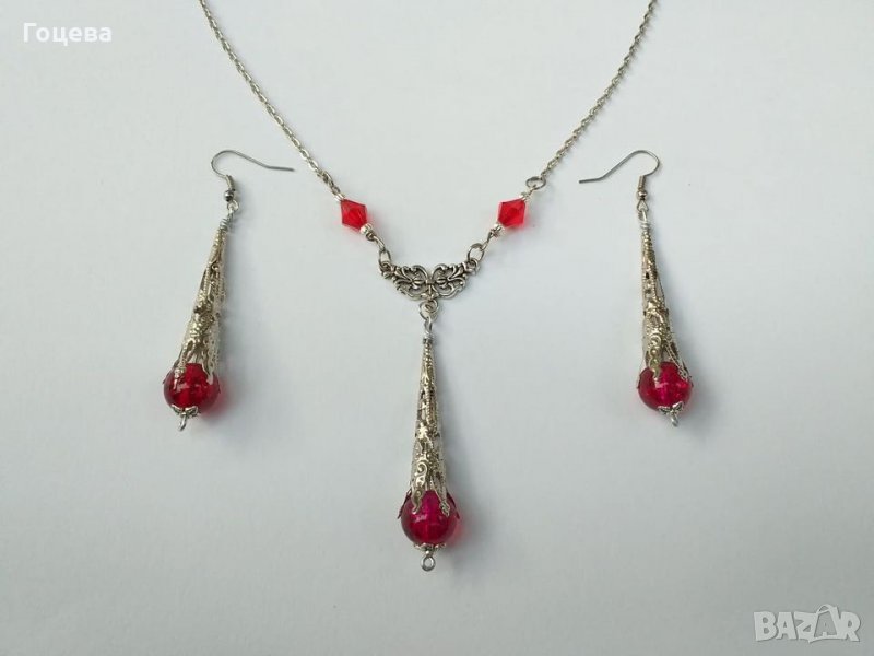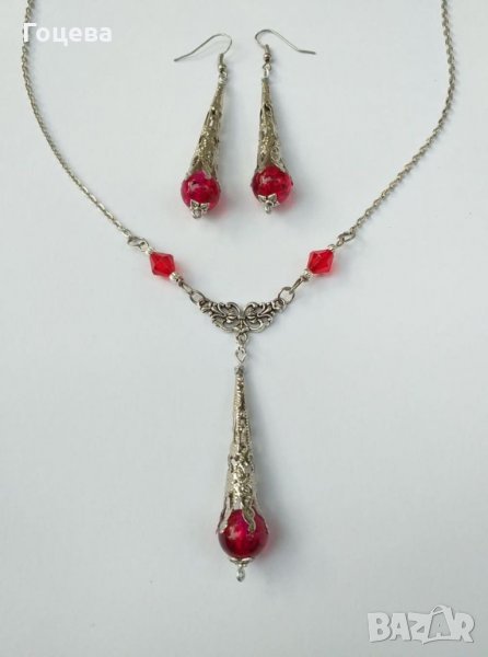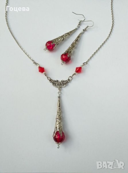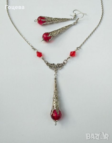 Разкошен Викториански комплект колие и обеци с рубинено червени кракъл мъниста и изящни орнаменти в цвят Антично сребро от новата ни колекция Прекрасно капковидно колие с нежен богато орнаментиран медальон с красиви рубинено червени кракъл мъниста и обеци в същият стил.Толкова изящни, толкова елегантни и царствени, същевременно нежни и стилни бижута !Носят огън в себе си, носят царственост и много стил ! Авторски дизайн. Ръчна изработка. Дължина на колието - 50 см. Дължина на медальона - 7.5 см. Дължина на обеците с кукичките - 7,5 см. Цена на комплекта - 35 лв.Поръчайте комплекта на тел.0899544215 Бърза доставка ! Доставяме до всяка точка на България !