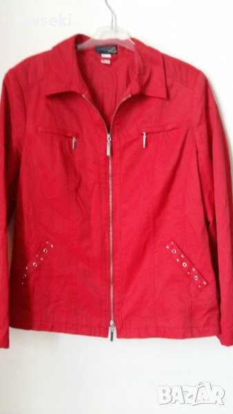 2. Червено дамско пролетно-есенно яке с капси по джобовете. Материята е много хубава, не се мачка. Размер XL, цена - 15 лв.