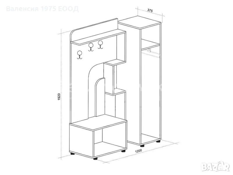 Портманто с три закачалки, отворени рафтове и гардероб с огледало.