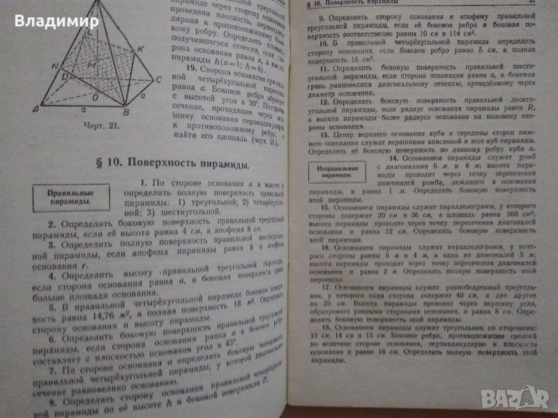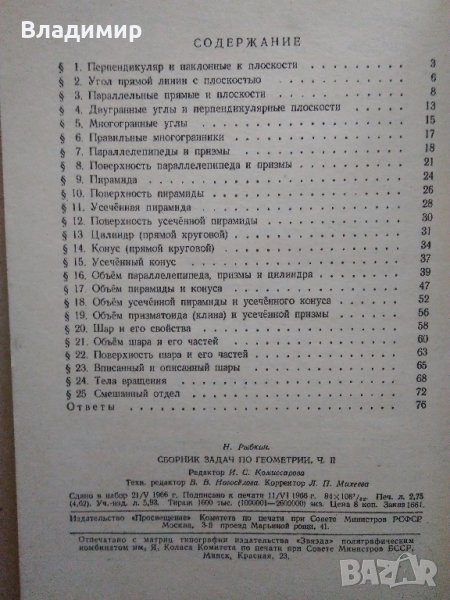 Продавам стар руски класически сборник от 1966 г. със задачи по геометрия, автор Н.Рыбкин известен руски педагог-математик. Втора част - за 9-ти и 10-ти клас с отговори на по-голямата част от задачите, а на останалите с указания за решения. Цена - 7 лева.