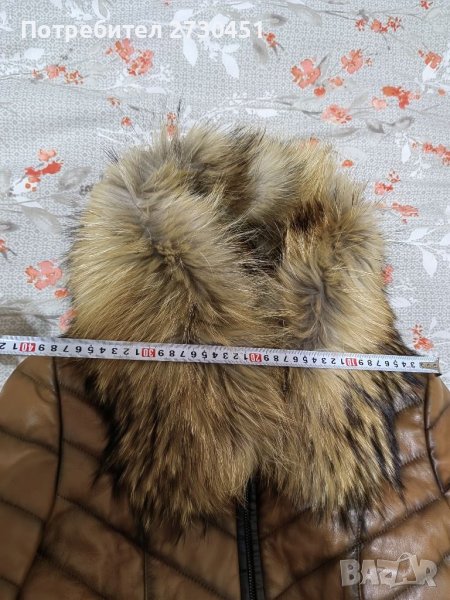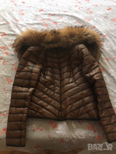 Дамско кафяво яке от естествена кожа с шармантна яка от канадска лисица (цяла кожа) по цялата качулка. Якето е ватирано, така че може да се ползва и при по-хладно време. Размер М-L.