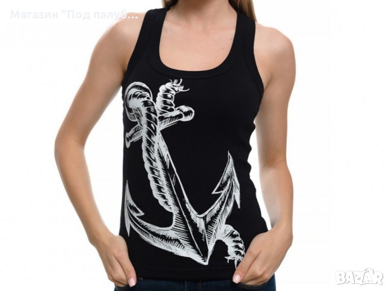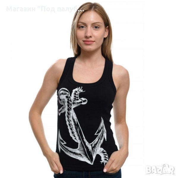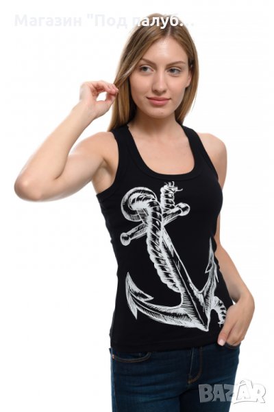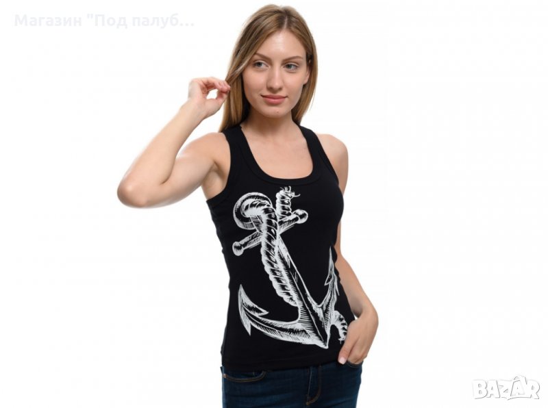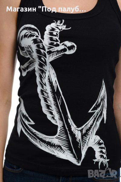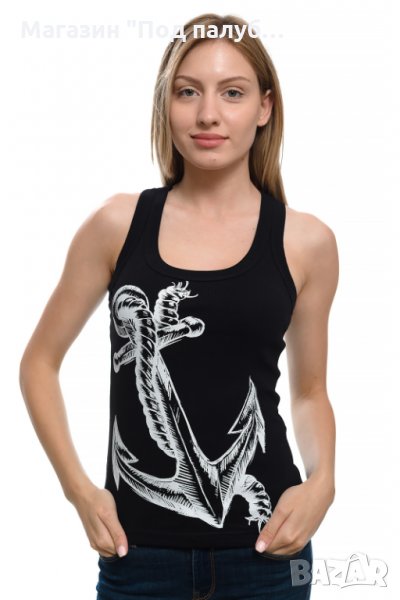 Нов дамски черен потник с трансферен печат Голяма котва, морски