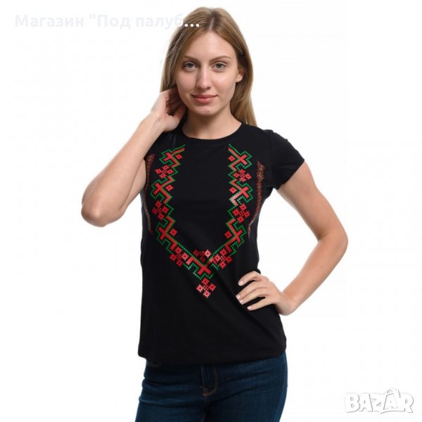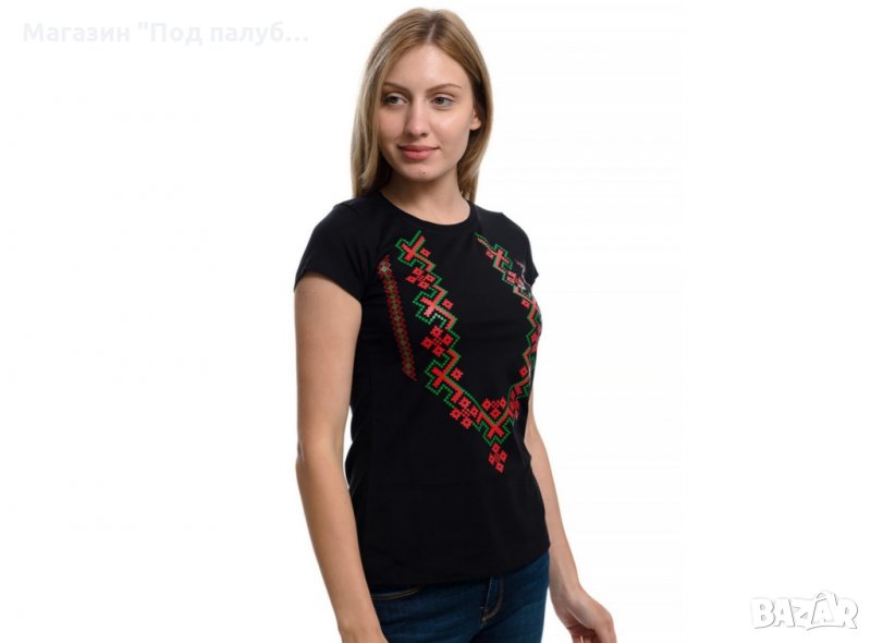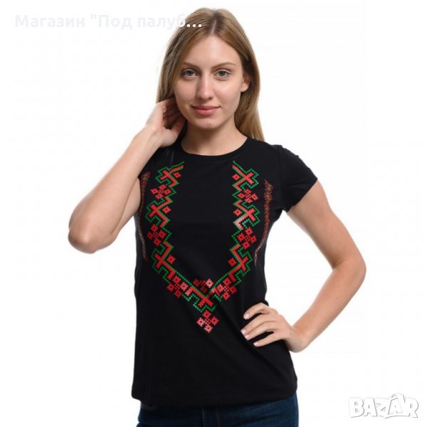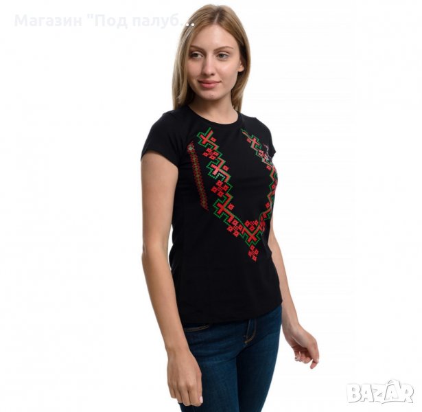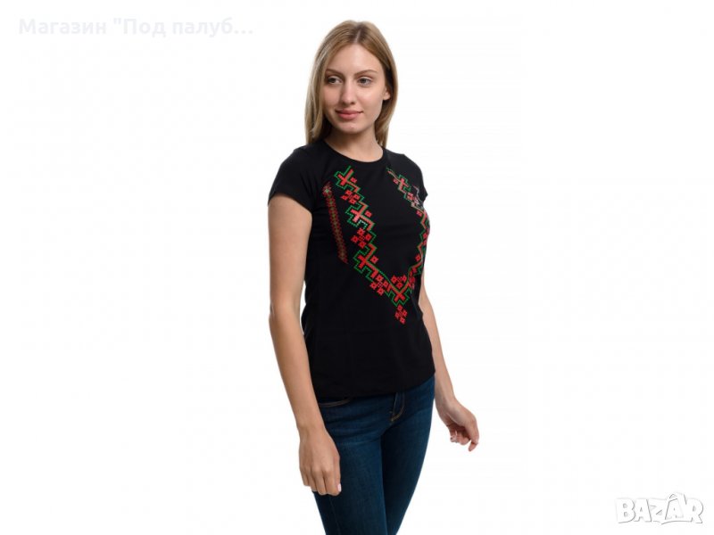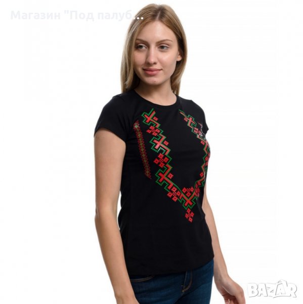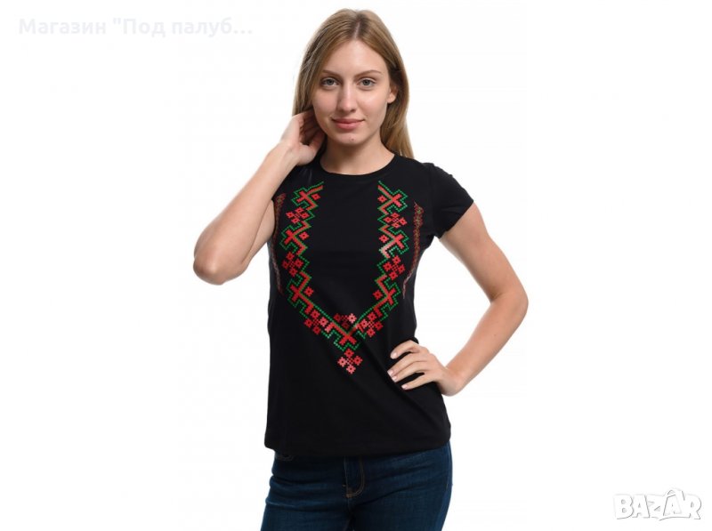 Нова дамска черна тениска с трансферен печат Шевица, Етно мотив, България