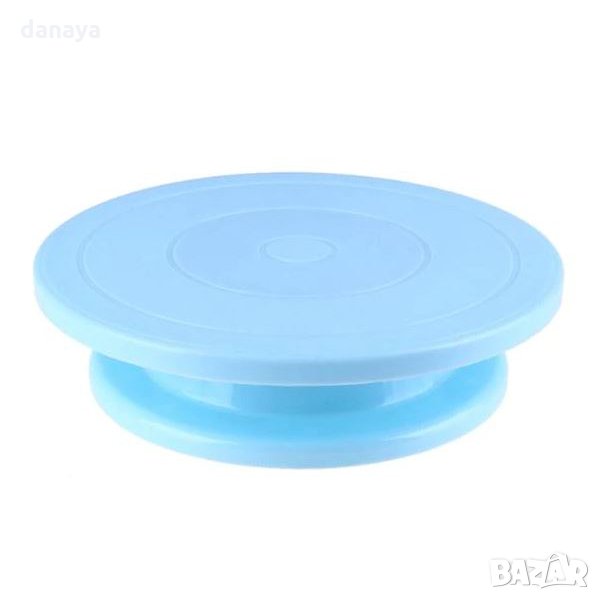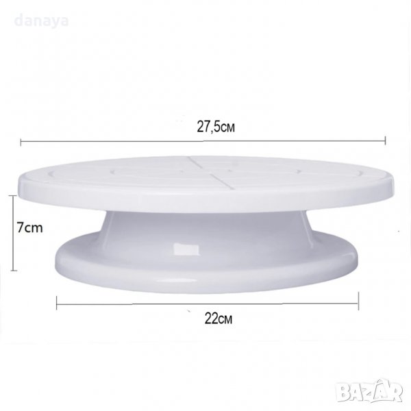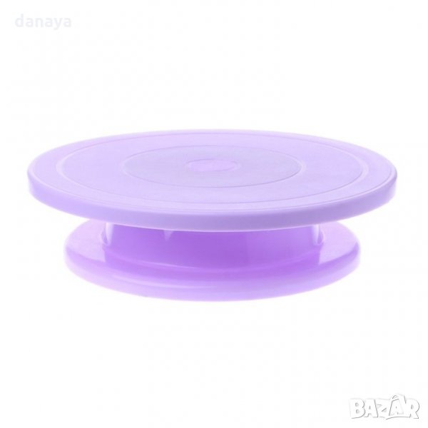Поставката за декориране на торти е в бял, розов, син или лилав цвят с диаметър 27,5 см, височина 7 см, изработена от пластмаса.
