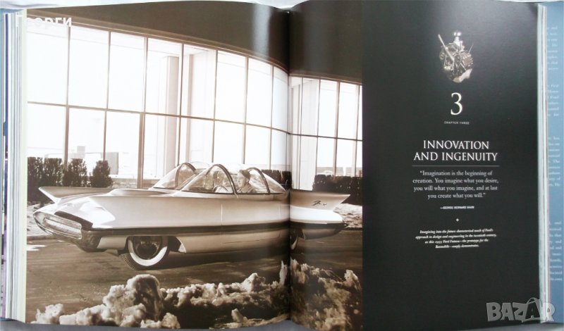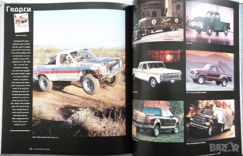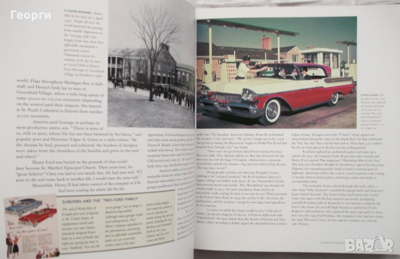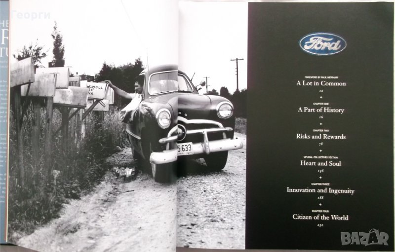 Продава се книга с историята на Ford за 100-годишната история на марката, публикувана през 2002 г. Разказва за историята на Хенри Форд и знаменитите му автомобили. Книгата е с твърди корици, формат - малко по-голям от А4 и подвързия. Има 272 страници, с дебела, луксозна хартия. Изключително запазена, само с леко износване на подвързията. Много ценен и рядък екземпляр на цена от € 42. На английски език.